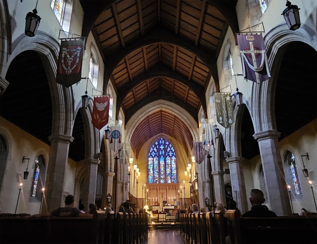 Compline happens in the sanctuary. Incense and candlelight are used during the service.