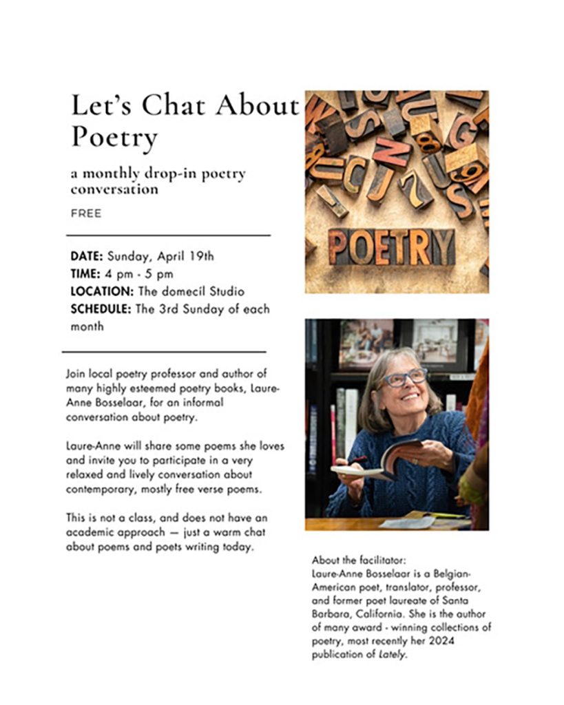NOTE NEW FORMAT: Please bring a poem that you love (not written by you) to read at our APRIL POETRY MONTH Poetry Chat —