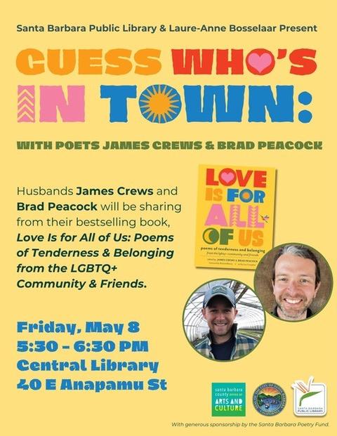 Celebrate two Vermont-based poets at the “Guess Who’s in Town” poetry reading series. Husbands James Crews and Brad Peacock will be sharing from their bestselling book, Love Is for All of Us: Poems of Tenderness & Belonging from the LGBTQ+ Community & Friends, in Central Library’s lovely Fireplace Room.